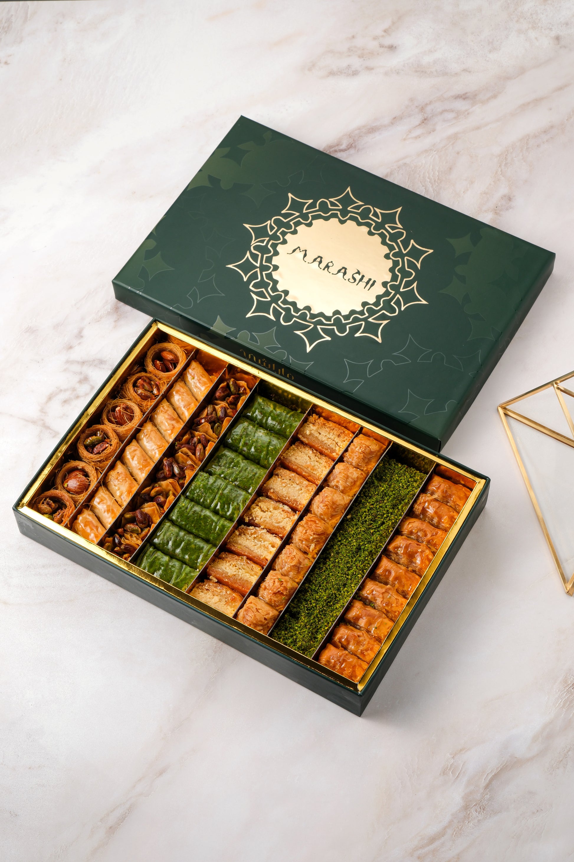Experience the magic of the Orient with Oriental Treasures. This box features a delightful mix of pistachios, walnuts, and almonds baklava, each piece bursting with authentic flavors.